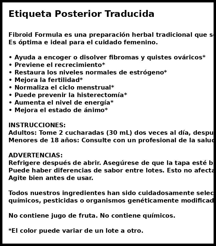 Descubra el poder de la naturaleza con Fibroid Formula, una potente fórmula herbal diseñada especialmente para apoyar la salud reproductiva femenina. Esta mezcla natural ayuda a encoger y disolver fibromas y quistes ováricos, equilibrar los niveles de estrógeno, regular el ciclo menstrual y mejorar la fertilidad, la energía y el estado de ánimo.